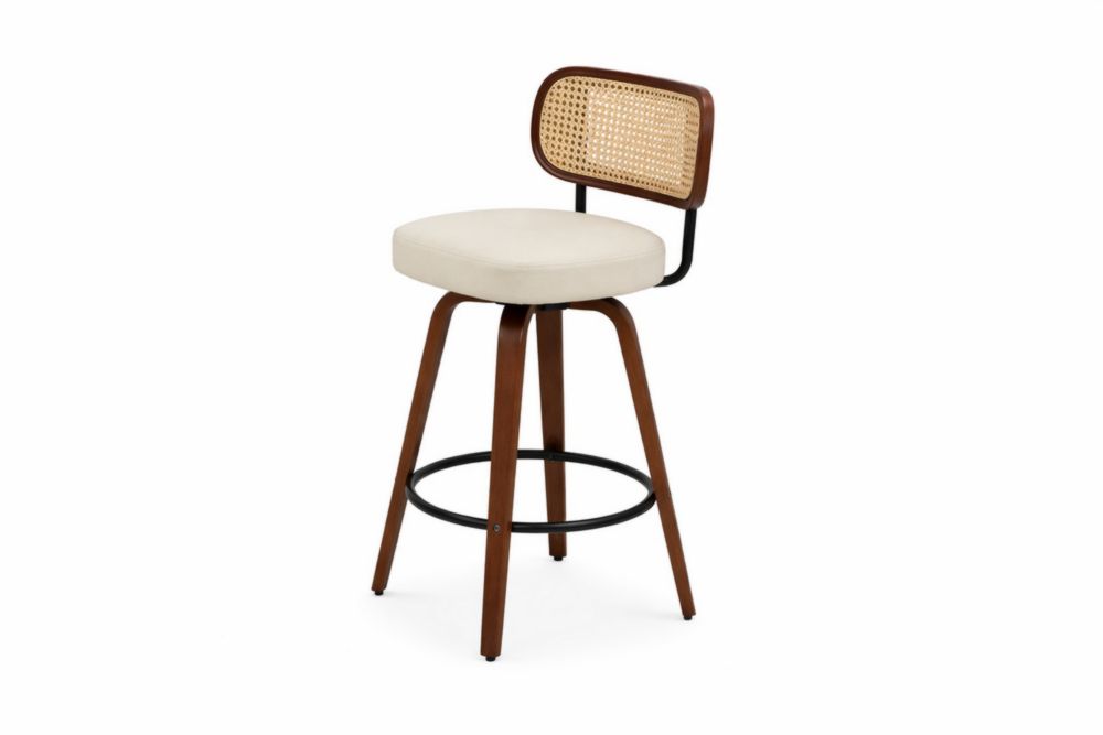 Sgabello da bar in Legno massello e rattan con seduta imbottita in tessuto beige
